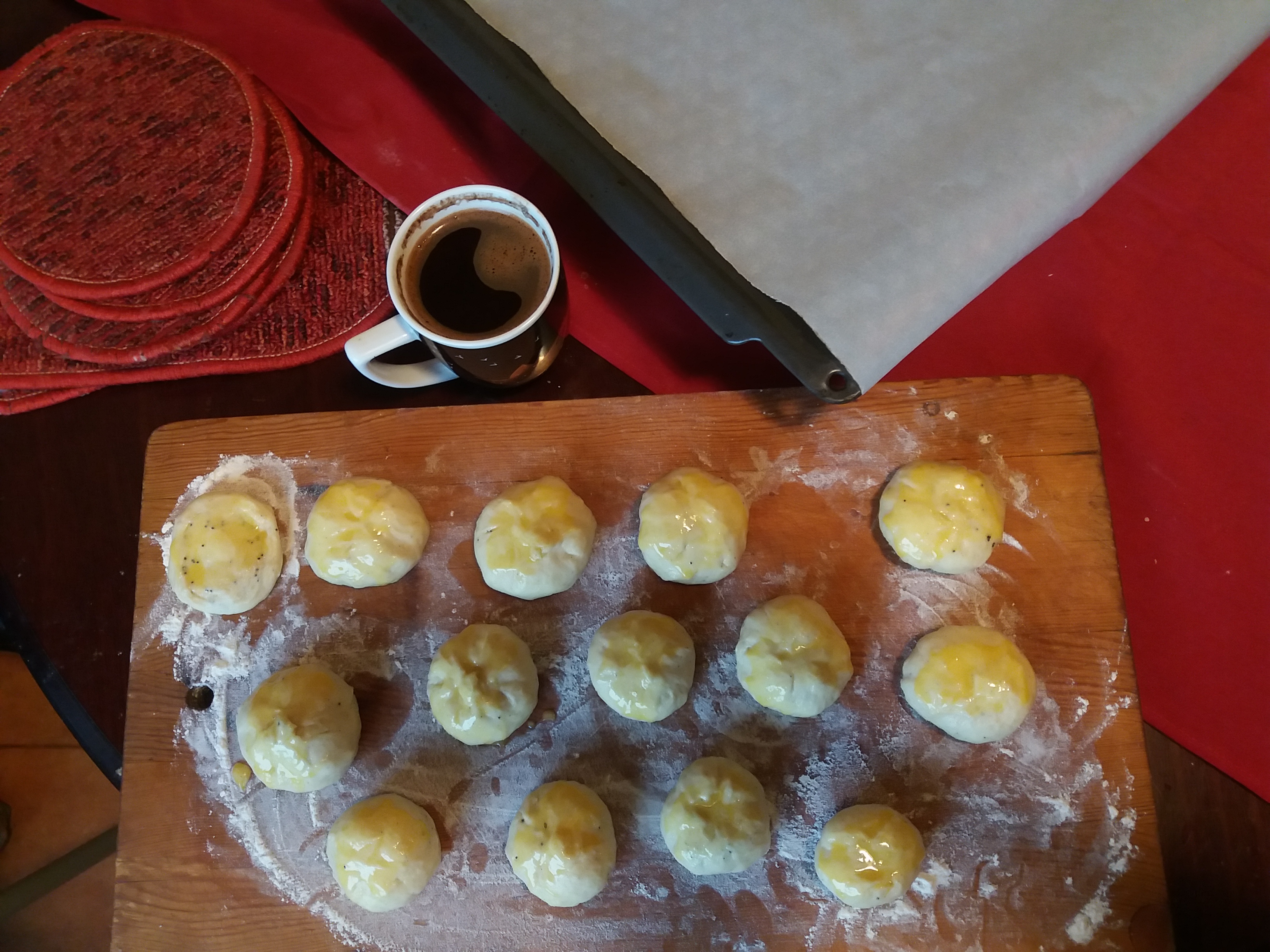이것을 커피와 먹으면 얼마나 맛있을까 상상하며 열심히 요리하는 와중에 홀짝이는 커피는 정말 그 음식과 함께 먹는 커피만큼 맛있다. 어쩌면 더 맛있는지도 모르겠다. 뒤늦게 회상하는 크리스마스, 호떡 반죽이랑 너무 비슷해서 몇개는 설탕을 넣어야겠다 생각하다 무심코 반죽을 다 써버린 빵.