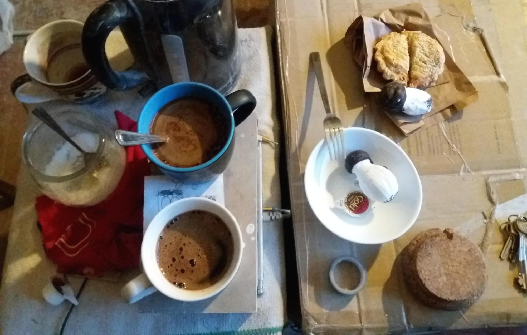 가끔 커피 마시는 곳. 아직 정리되지 않은 곳이지만 매 순간 미세하게 정리가 되고 있는 중이니 아쉬움과 즐거움이 공존한다. 이곳에는 지난번에 마시고 씻지 않은 커피 찌꺼기가 묻은 티스푼이나 액상 프림, 걸레 빤 물이 가득한 빠께쓰와 오래된 먼지와 남이 버린 책 같은 것들이 혼재한다. 그리고 20미터 거리에 빵집이 있다. 친구와 빵집에서 캐온 버섯과자에 커피를 마시며 전재산을 털어서 산 조그만 미니밴에서 새 출발을 해야 한다면 그곳에 뭘 집어넣을지에 대해서 이야기했다. 컵은 꼭 필요할 거다. 양치질도 하고 커피도 마시고.