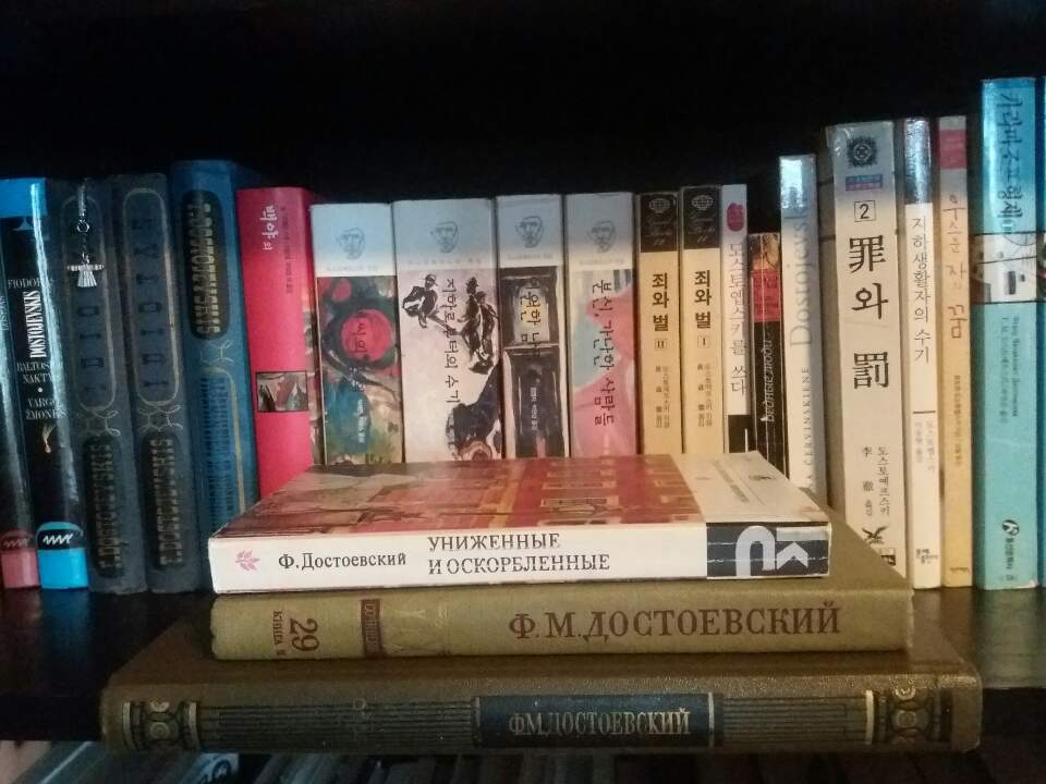 2년 전쯤인가. 문득 올해 이즈음에 뻬쩨르에 가게 된다면 참 좋겠다 생각했었는데. 구시가에 헌책방이 많은데 러시아어 책들이 꽤 많아서 돔끄니기 간다는 느낌으로 가끔 찾아간다. 고양이 한 마리가 온 사방 책을 누비며 기어 다니는 어떤 책방에서 지난달에 발견한 몇 권의 책들. 마치 어린이 도서관에 제일 찾기 쉽게 생긴 안데르센이나 그림 형제 동화 모음집처럼 두껍고 큰 판형의 책은 '죄와 벌'과 '가난한 사람들', '아저씨의 꿈'이 함께 수록되어있는 독특한 조합의 책이고 두 번째는 그가 보낸 서신의 일부를 모아놓은 책. 그리고 마지막은 겉표지의 일러스트가 눈에 들어왔던 '멸시받고 모욕당한 사람들'. 이 책은 오래전 리투아니아어로 꾸역꾸역 날림으로 읽고 비교적 최근에 한글로 다시 읽어서 느낌이 남달랐다. 나타샤와 이흐메네프가 다시 조우하면서 포옹하는 장면, 이반이 먼 곳에서 목도하는 다리 위에서 구걸하는 넬리의 모습이 앞표지와 뒤표지에 나란히 그려져 있다. 이 책방에는 유난히 러시아어 책들이 많고 특히 서점 가장 깊숙한 곳의 책장에는 주요 작가들의 다양한 판본의 작품들이 거의 전집처럼 모여있는데 최대한 생김새가 다른 책들을 골라왔다. 이 책들을 한글 읽듯 술술 읽는 것은 여전히 불가능하지만 눈감고 펼쳐보는 어떤 페이지에서 그럭저럭 해석되는 몇 문장을 바탕으로 어림짐작하여 한글 버전이나 리투아니아어 버전의 같은 부분들을 찾아 하루에 몇 페이지씩만이라도 비교하며 읽어보곤 한다. 아주 짧고 일상적인 문장들이라도 그가 손수 써나간 문장이라고 생각하는 순간 독특한 일체감이 느껴지기도 하고 그가 정말 언젠가 존재했다는 것이 실감 나기도 한다. 영원히 알 수 없을것 같은 누군가를 알게 되었다고 말하는 것에 용기를 필요로하는 존재를 소개받았다는 것은 내게 주어진 지나친 행운이다. 표도르 미하일로비치! 생일 축하해요.