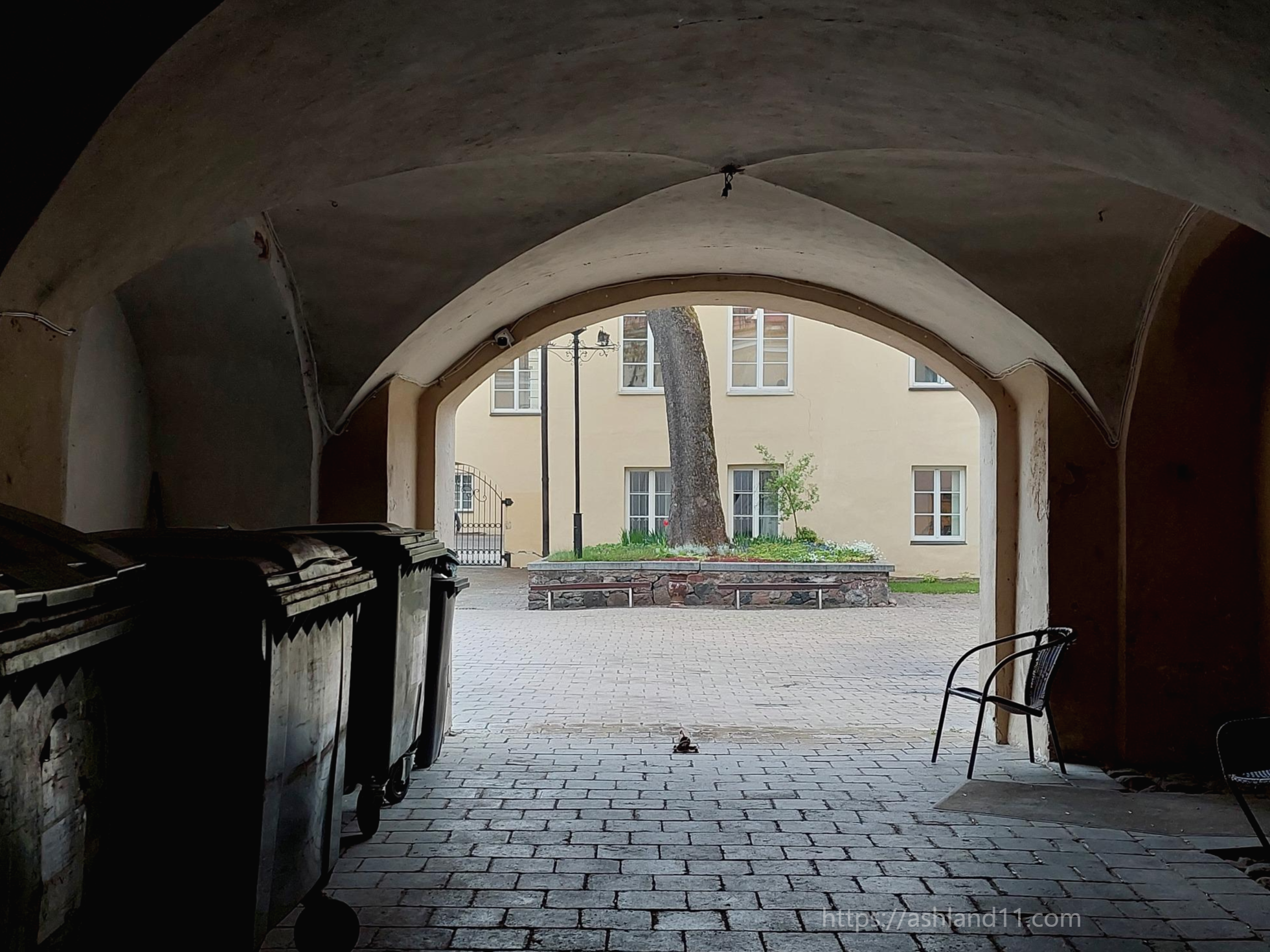 비가 무지막지 쏟아진 것은 아니지만 그래도 한 번 정도는 멈춰서 기다려줘야겠다 생각해서 들어 선 곳은 필리에스 거리에서 빌니우스 대학의 작은 마당을 잇는 낮은 궁륭을 이고 있는 통로. 빌니우스 대학 인문학부가 구시가 한복판에 있는데 이 길을 통하면 크고 작은 대학 정원들을 거닐다 대통령궁 앞광장으로 바로 빠져나올 수 있다. 비를 피할 수 있는 곳은 많다. 가끔은 나무 아래에 서있을 수도 있고 성당안으로 들어 갈 수도 있고 건물의 중정으로 이어지는 이런 통로들도 그렇다. 비를 감상하는 동안의 머릿속은 어떨까. 집을 나오기 전 우산을 집을까 말까 망설이던 순간에 대한 짧은 회상, 금방 그칠 것이라는 기대감과 대부분의 경우 그 기대를 충족시키려고 노력하는 비에 대한 고마움. 비를 관람하고 있는 모두가 함께 어딘가로 좀체 서두르지 않고 있다는 자각으로 인한 동질감, 그리고 어쩔땐 너무 금방 멈춰버리는 비에 대한 아쉬움. 그렇다.