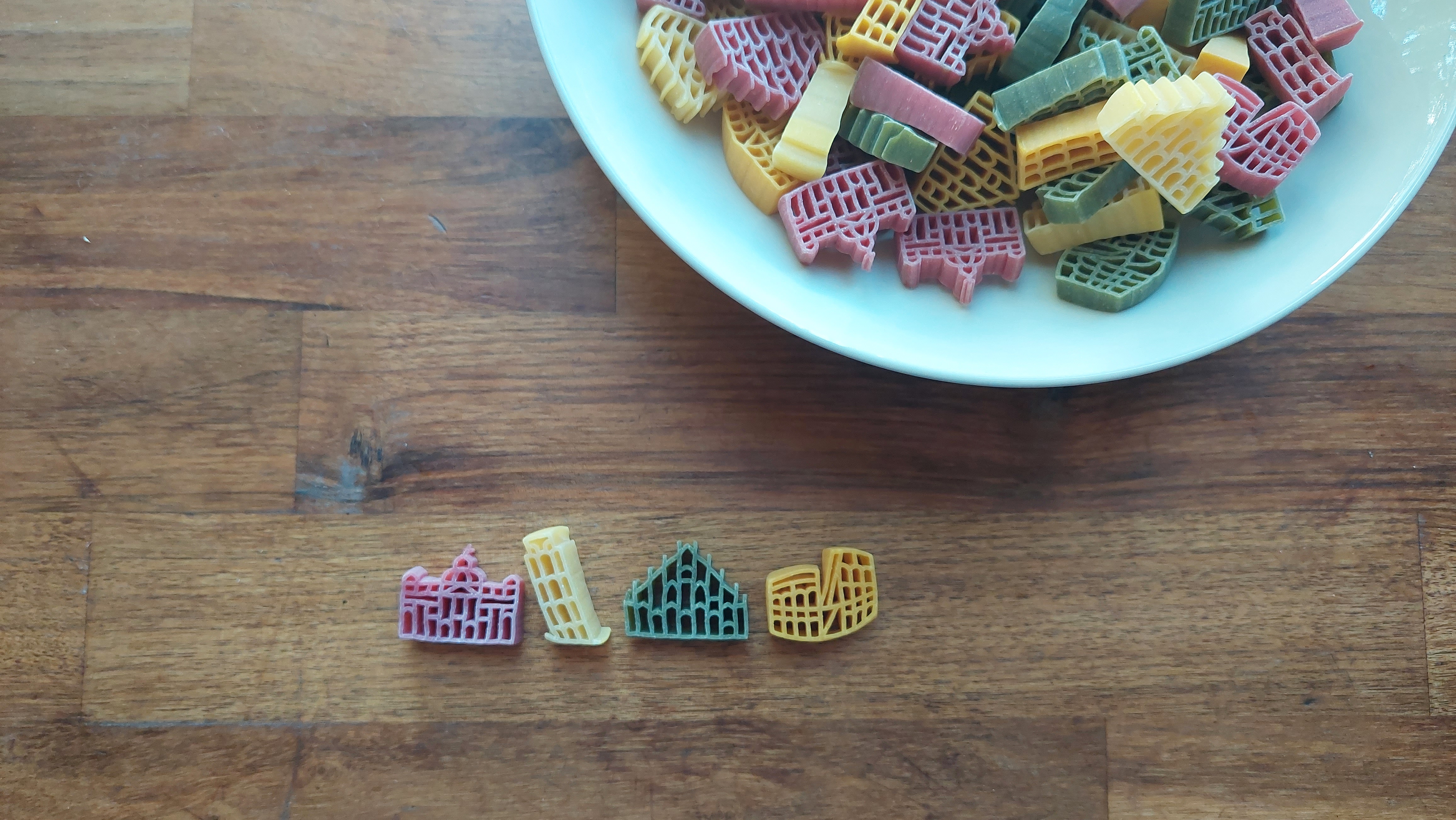 파스타에는 4종류의 건축물이 있는데 왼쪽부터 베드로 성당, 피사의 사탑, 콜로세움으로 보이며 세 번째는 모르겠다. 어쨌든 건축물 한 개씩은 삶지 않고 기념으로 남겨놓기로 했다. 로마에 갈 때 쥐고갈 판. 베드로 성당 앞에 가면 왠지 저런 모양의 열쇠고리들을 열 개들이로 묶어서 팔고 있을 것 같다. 약간 어릴 때 그레이트라고 부루마블이랑 비슷한 보드게임을 친척 언니들과 자주 했었는데 약간 그때 세워놓는 호텔 빌딩 별장 표시들이랑도 많이 비슷했다.