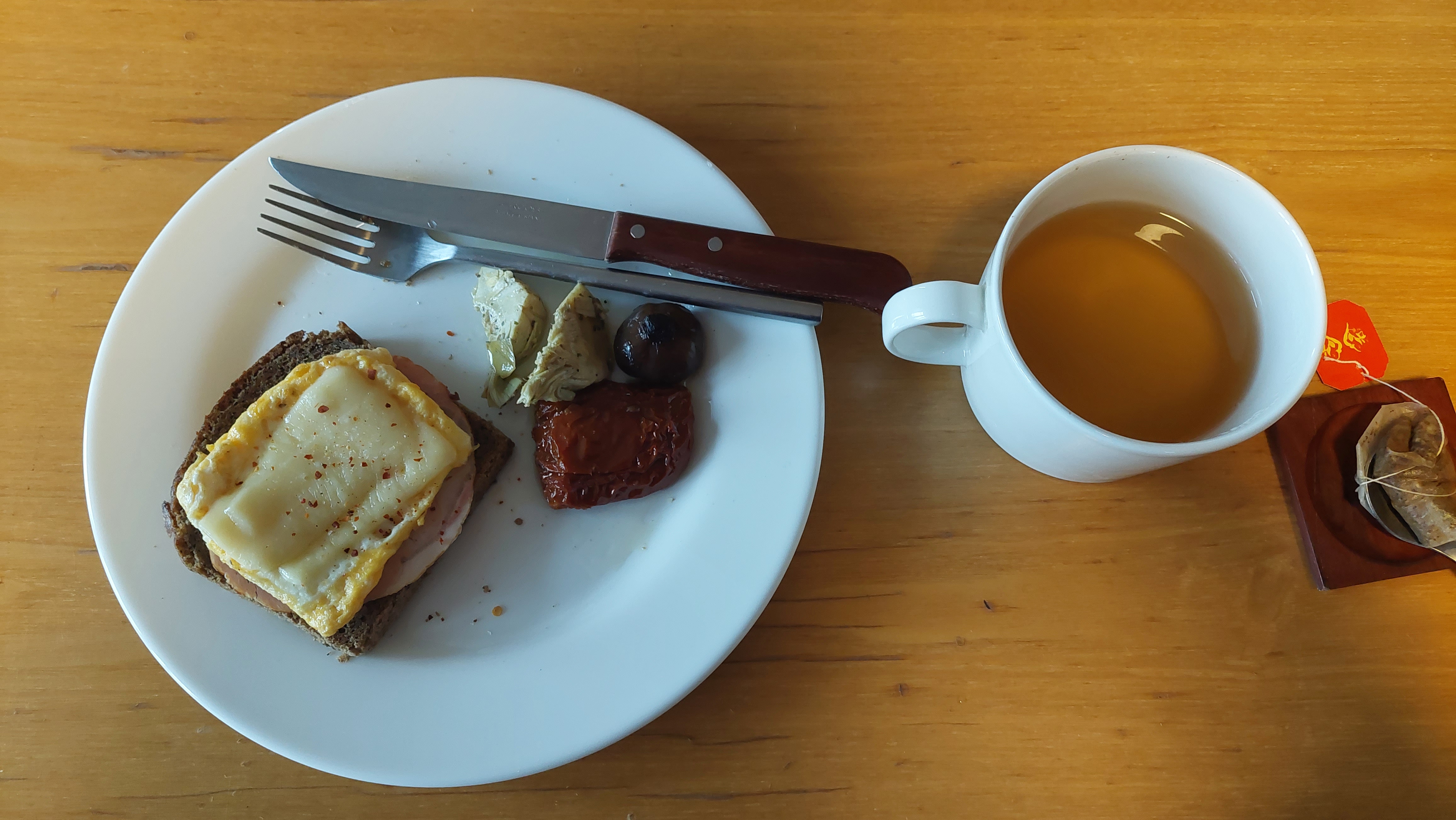 가진 잼 모두 발라서 겨란 후라이와 고기 한 점. 굳이 겨란 후라이라고 하면 양양 큰집의 부엌에 여물 끓이는 아궁이 근처 위에 앉아 있을 때 친척언니가 겨란 후라이라면서 부쳐주던 게 생각난다. 아궁이 속에서 타고 있던 장작향이 입혀진 건지 약간 곤로 위에서 만든 듯한 그 후라이 특유의 냄새도 같이 기억에 딸려 나온다.