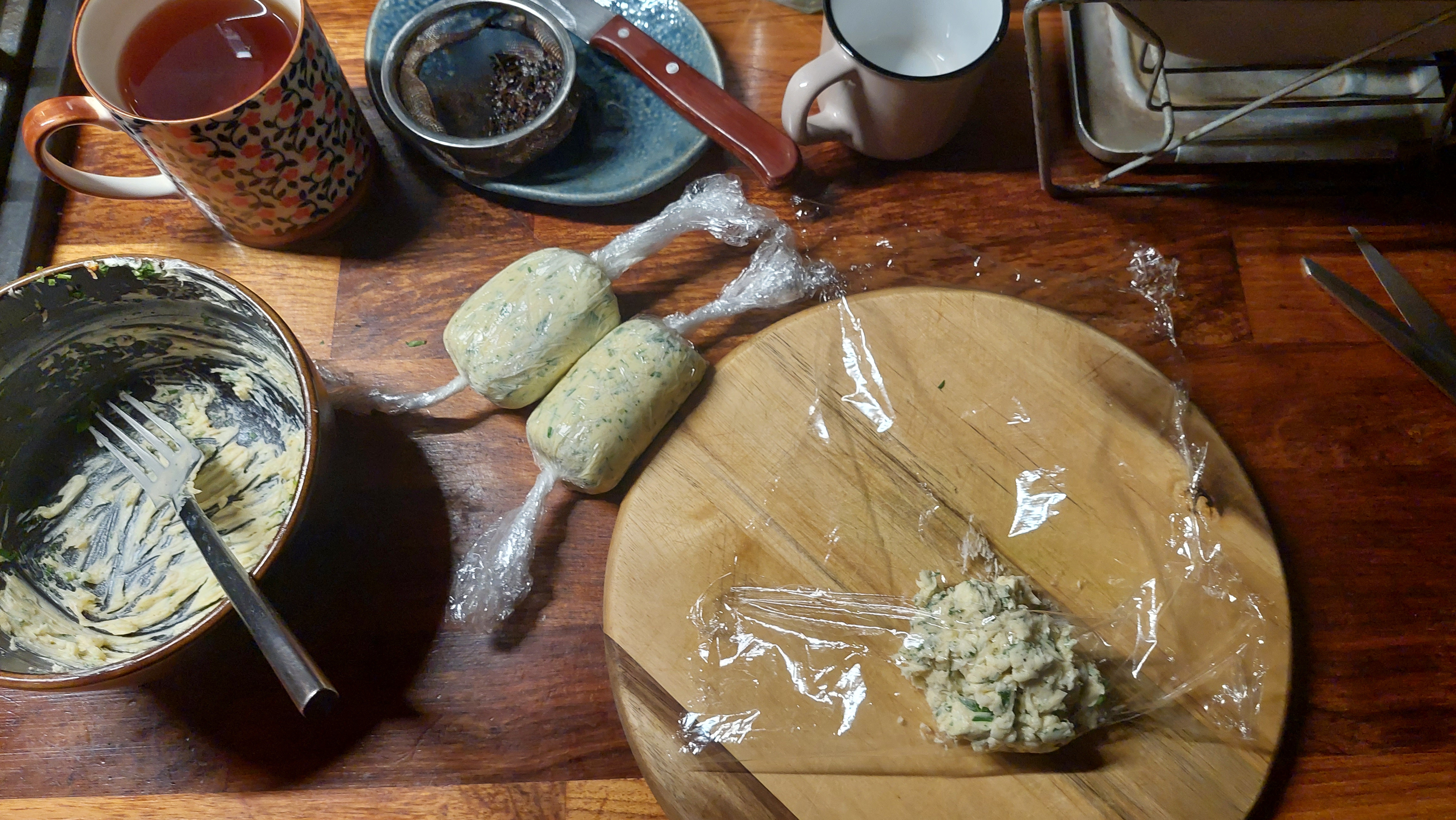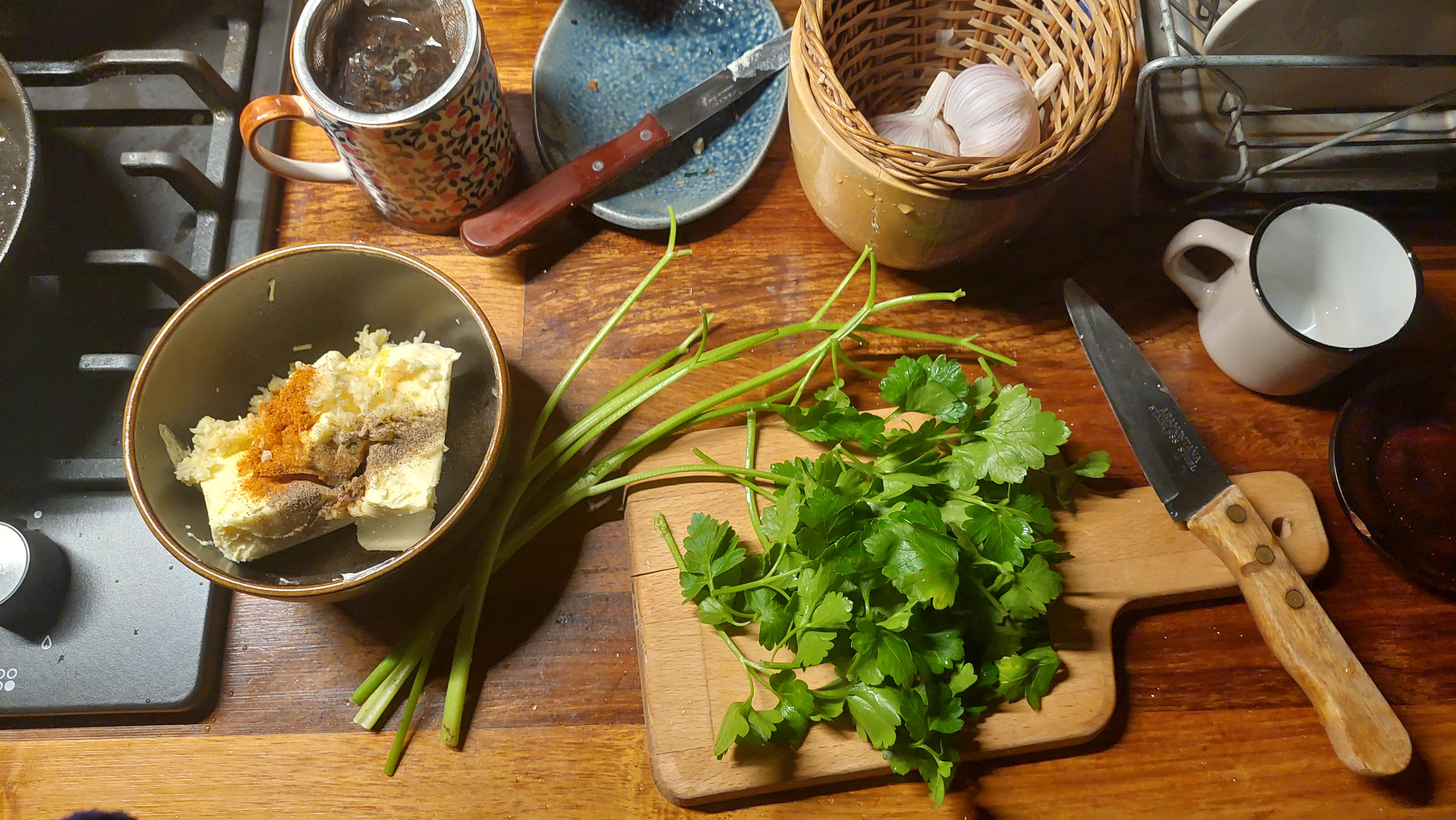 어쨌든 허브 버터 만드는 방법이 수없이 많겠지만 그냥 마늘 10톨 정도를 다졌고 파프리카 가루나 후추등 뭔가 맛에 영향을 줄 것 만 같은 향신료들과 다진 파슬리를 넣고 골고루 섞는다. 마늘에 통째로 오일을 뿌려서 포일에 싸서 오븐에 넣어서 구우면 마늘이 정말 치약처럼 되어서 쭉 빠져나오는데 그걸 버터에 섞는 방법이 있는데 달랑 마늘을 굽겠다고 오븐 한 시간을 돌리는 게 아까워서 관뒀다. 원래는 차를 다 우릴 때까지 완성해서 치우는 게 목표였는데 결국 거름망 건져내고 차 마시며 계속 만든다.