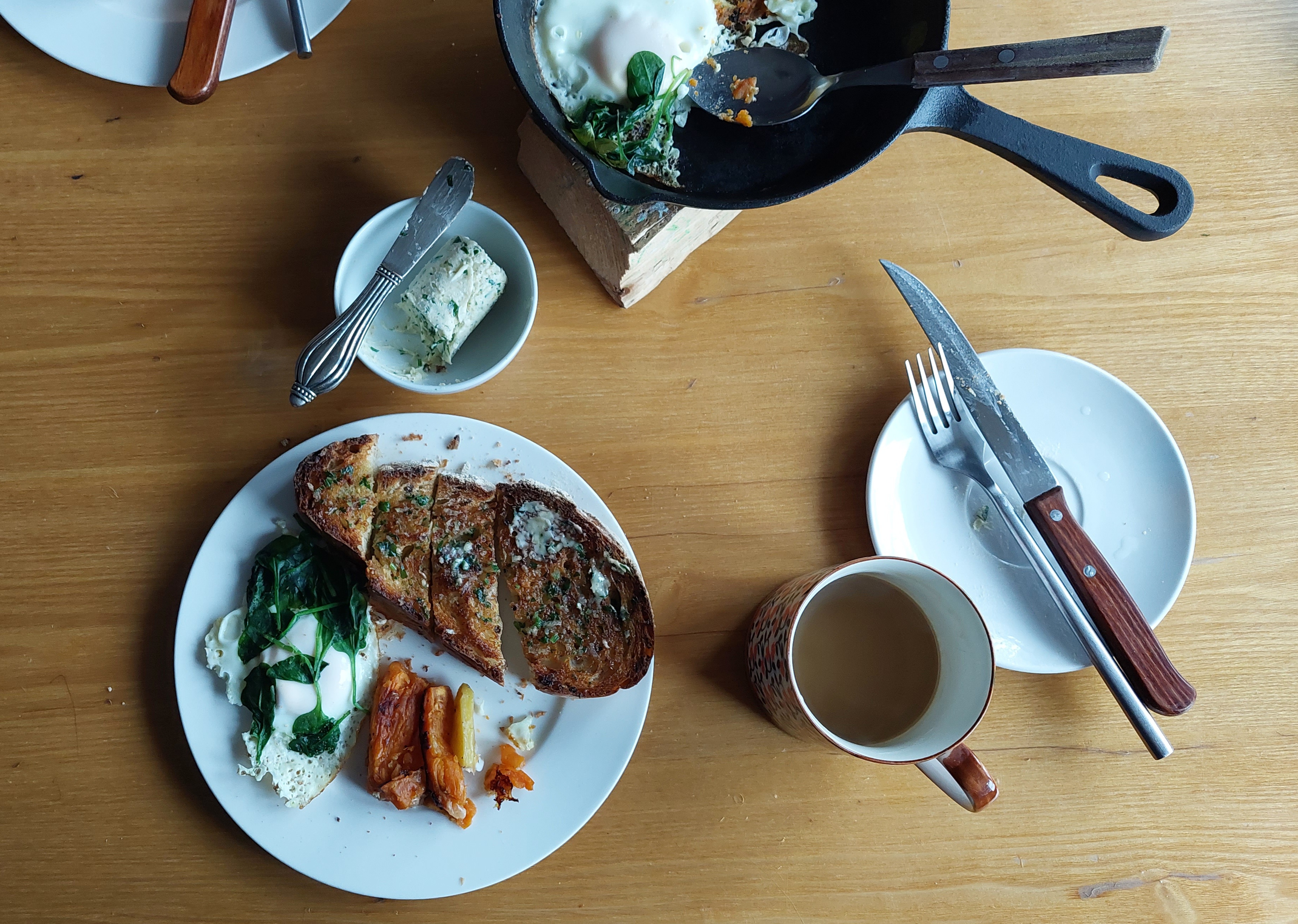 토스트한 두꺼운 빵에 바르면 버터는 파슬리만 남기고 빵의 중간 부분까지 사르르 녹아 내려간다. 먹다 남은 구운 고구마와 함께 아침 식사.