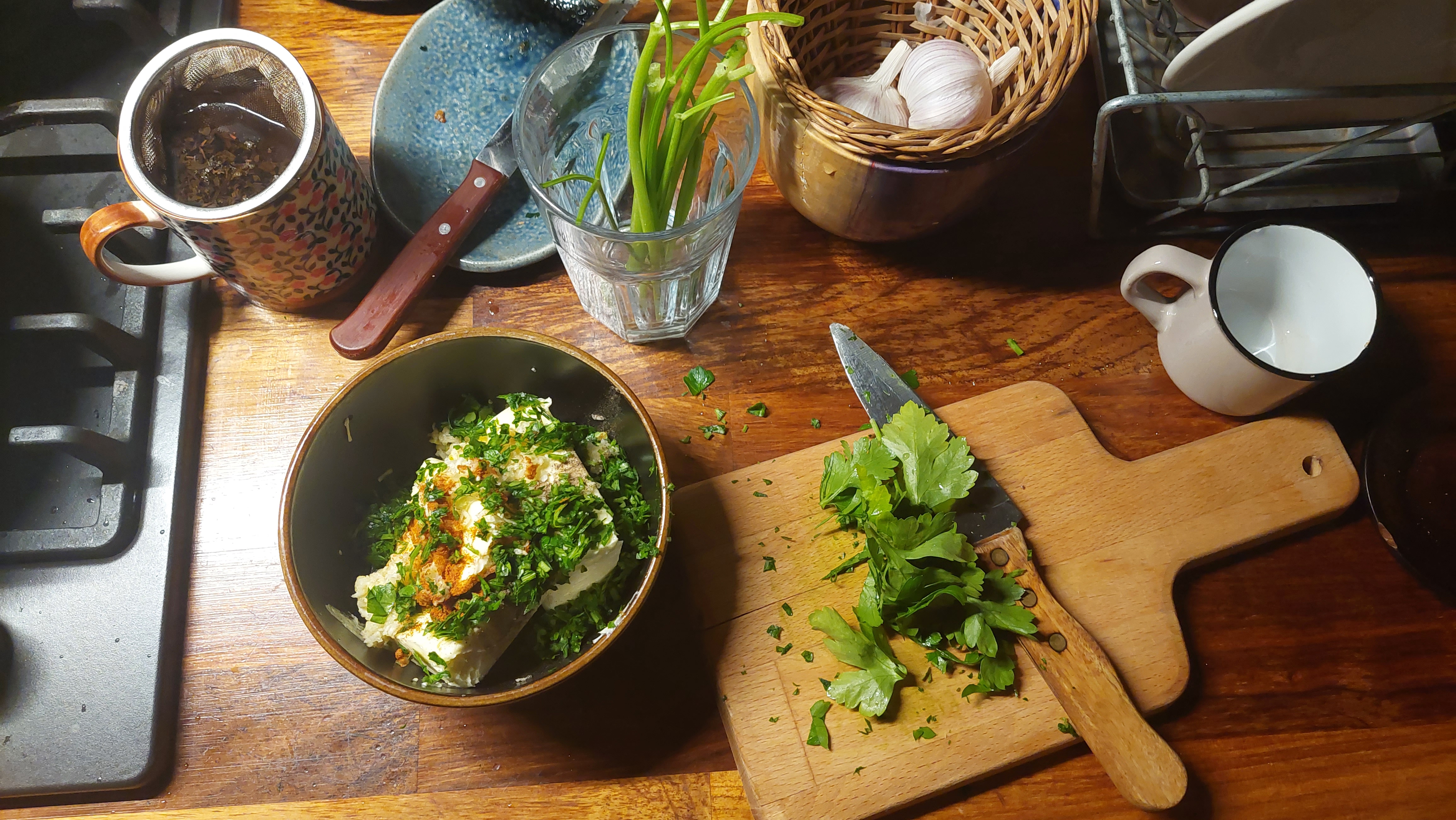 어쨌든 허브 버터 만드는 방법이 수없이 많겠지만 그냥 마늘 10톨 정도를 다졌고 파프리카 가루나 후추등 뭔가 맛에 영향을 줄 것 만 같은 향신료들과 다진 파슬리를 넣고 골고루 섞는다. 마늘에 통째로 오일을 뿌려서 포일에 싸서 오븐에 넣어서 구우면 마늘이 정말 치약처럼 되어서 쭉 빠져나오는데 그걸 버터에 섞는 방법이 있는데 달랑 마늘을 굽겠다고 오븐 한 시간을 돌리는 게 아까워서 관뒀다. 원래는 차를 다 우릴 때까지 완성해서 치우는 게 목표였는데 결국 거름망 건져내고 차 마시며 계속 만든다.