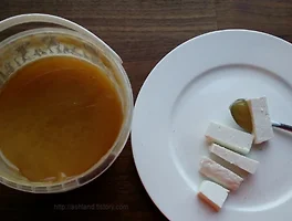 이렇게 만들어 놓은걸 한 번에 다 먹기 힘드므로 3번 분량으로 나눠서 얼린다. 보통 더 굵게 만들지만 나누면 그렇게 굵게 나오지 않는다. 비비빅 정도의 굵기. 랩에다가 얹고 잘 굴려서 감싼 후에 양 끝을 잡고 위로 밀었다 아래로 밀었다 하면 돌돌 말리면서 삐삐 머리가 된다. 얼핏 보면 곰팡이 치즈 같기도 하다. 먹기 전 날 냉동실에서 꺼내뒀다가 발라 먹는다. 버터 묻은 식기를 씻는 것 만한 체벌이 없고 그렇게 씻겨 나가는 버터가 아까우므로 최대한 도구 하나로 끝내야 한다. 그리고 저 그릇은 그냥 놔둔다. 다음날 아침 상온에서 패배적으로 녹아있는 이것을 샅샅이 발라 먹을 때가 사실 가장 맛있다.