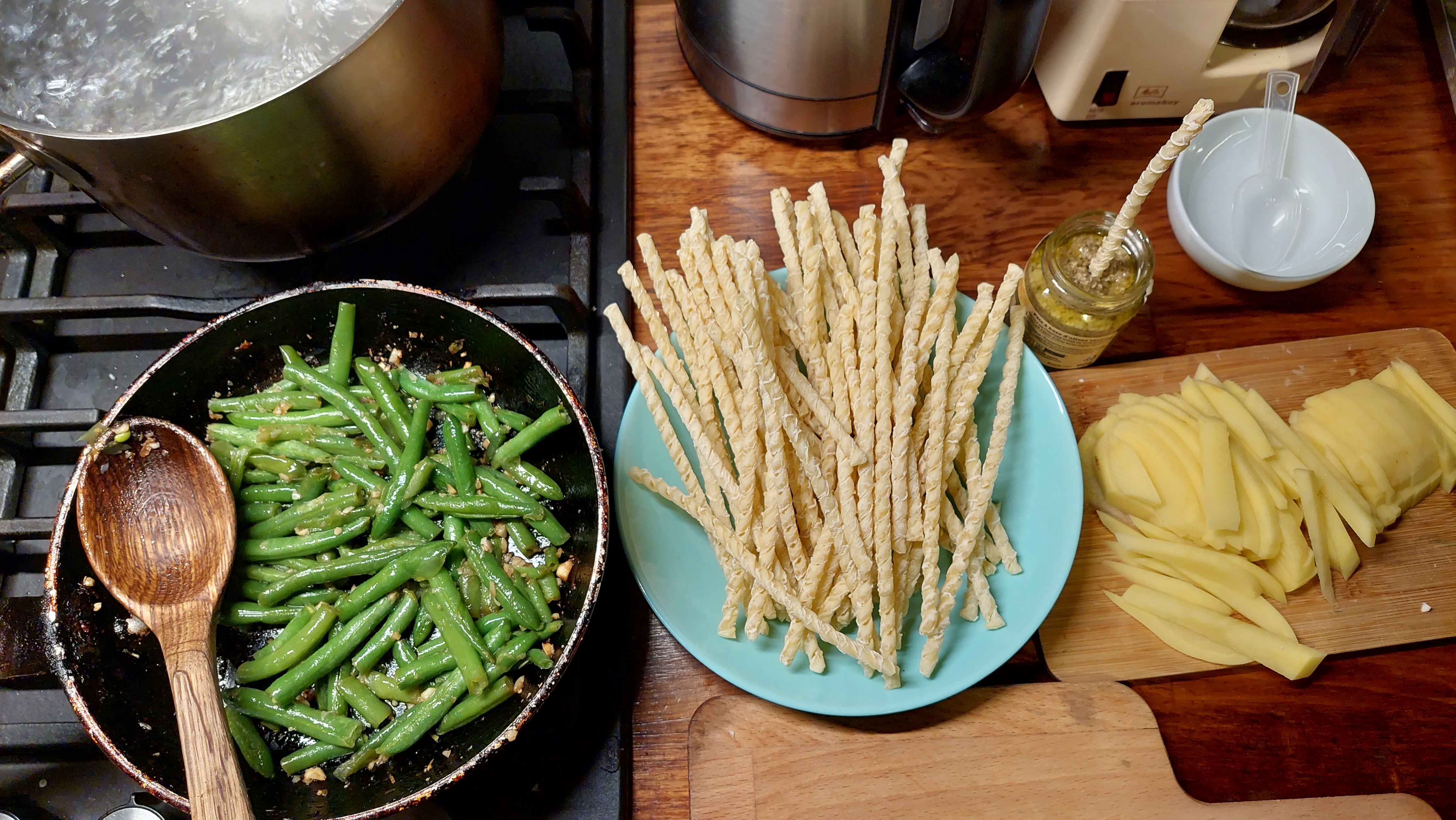 원래 이걸 그냥 삶아서 간단하게 바질 페스토에 비벼 먹으려고 했는데 바질 페스토라고 얼마간 굳게 믿고 있었던 작은 병을 꺼내보니 올리브 타프나드였다. 바질 페스토는 정말 그냥 면이랑만 섞어도 맛있지만 타프나드는 특히 검은 올리브가 아닌 그린 올리브라면 또 호불호가 갈려서 이 맛을 숨겨줄 뭔가 다른 재료가 필요하단 생각에 이것저것 파스타와 비슷한 길쭉한 것들을 꺼냈다.