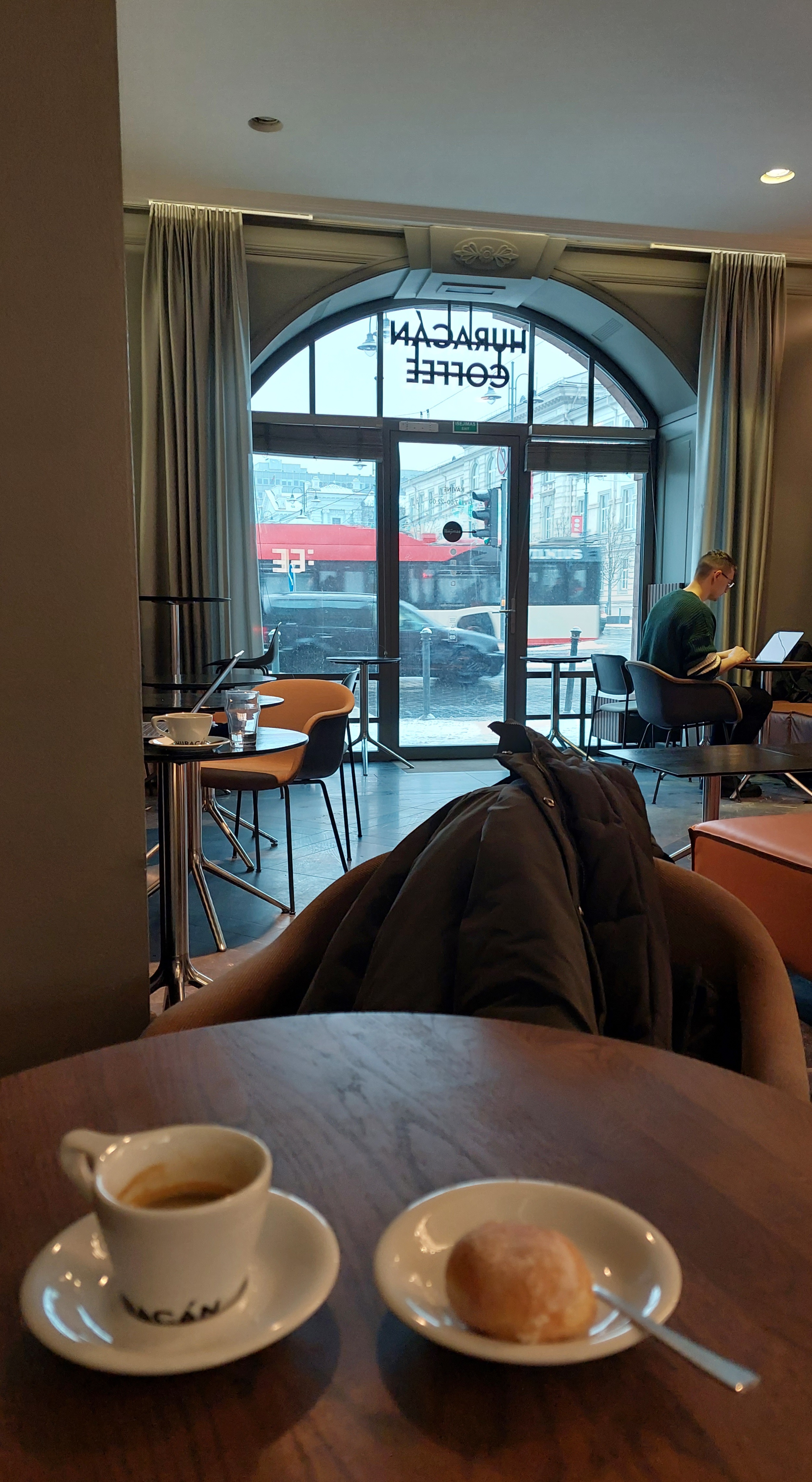 트롤리버스를 타고 출근을 하다 보면 구시가를 한 꺼풀 감싸며 돌다가 외곽으로 빠지기 전의 트롤리버스들이 정류하는 곳마다 거의 카페들이 자리 잡고 있다. 이미 적당히 위장을 채우고 집을 나선 나에게 이 카페들이 너의 나른한 위장을 우리집 카페인으로 깨워주겠다며 트롤리버스 창문 너머로 손짓하는데 나도 굳이 외면하지 않는다. 그래서 간혹 두 정거장 정도 타고 가다 내려서 잠깐 앉아서 커피로 속을 헹구고 다시 남은 다섯 정거장을 타고 가던 길을 가곤 한다. 겨울을 보내고 봄을 맞이하는 우즈가베네스 축제도 지났는데 날씨가 더 추워졌다. 진눈깨비가 짙게 내리던 날, 이른 아침이지만 마치 지정석에 앉아 있는 듯한 느낌을 주던 사람들로 이미 반 정도 채워진 카페에 나도 자리 잡았다. 아침에 혼자 일하는 직원은 일손이 모자른 가운데에서도 역시나 침착하다. 재촉하는 이도 없다. 에스프레소와 미니 도넛을 주문했다. 컵이 없어서 물은 가져오지 못했다.