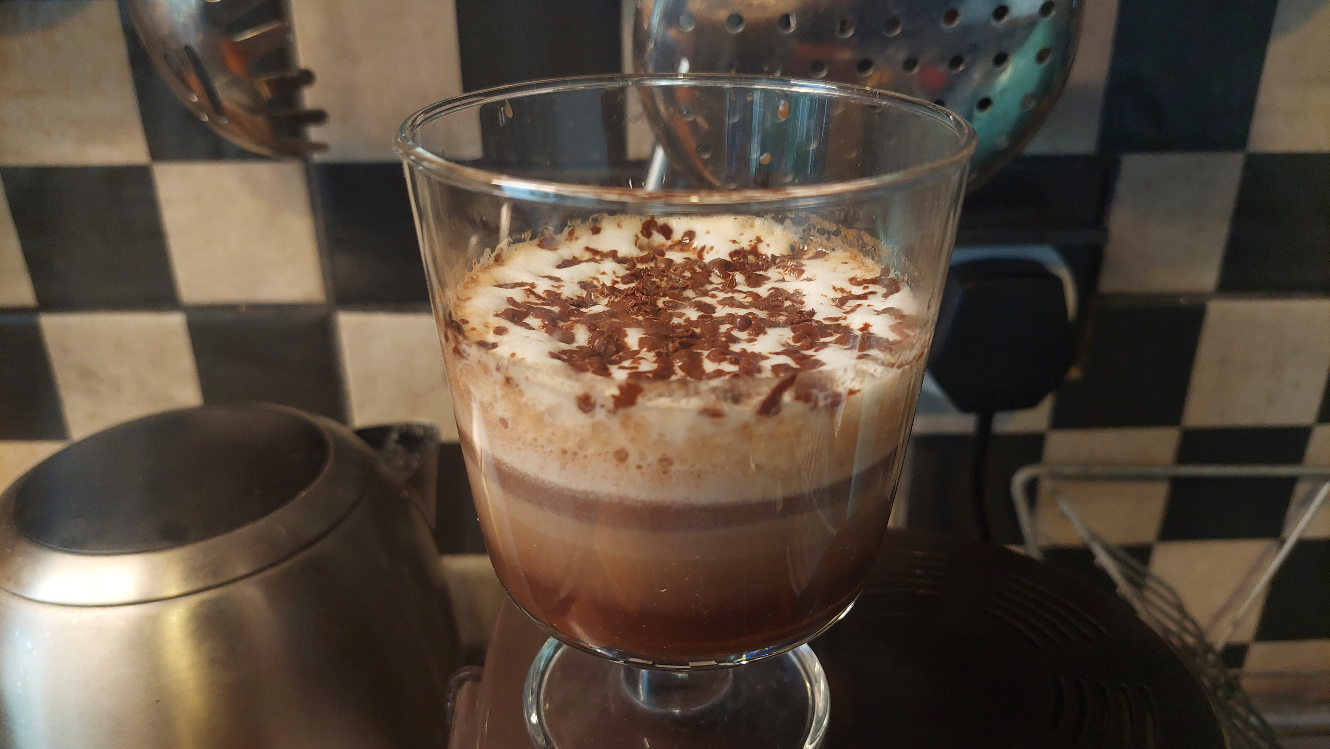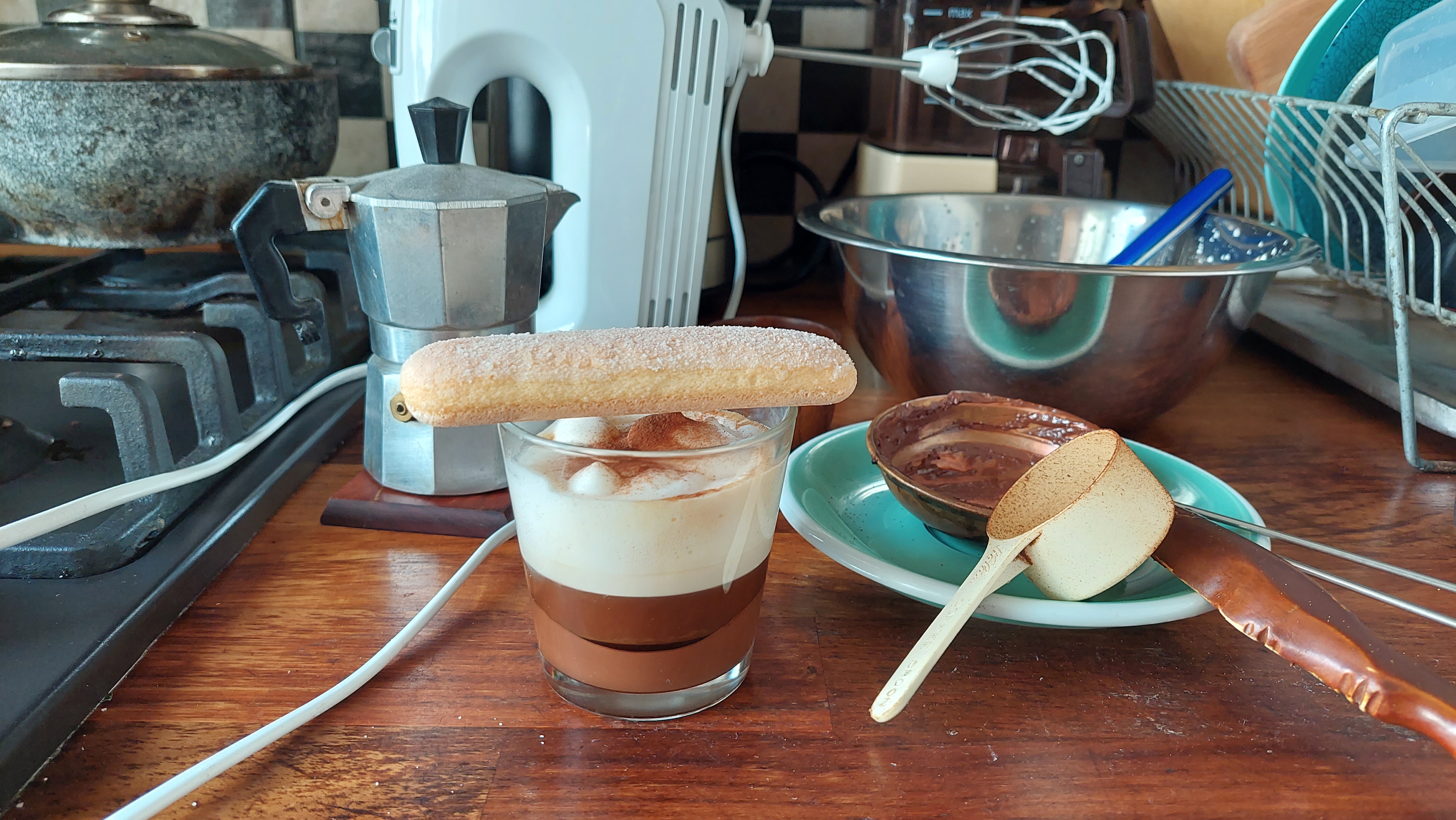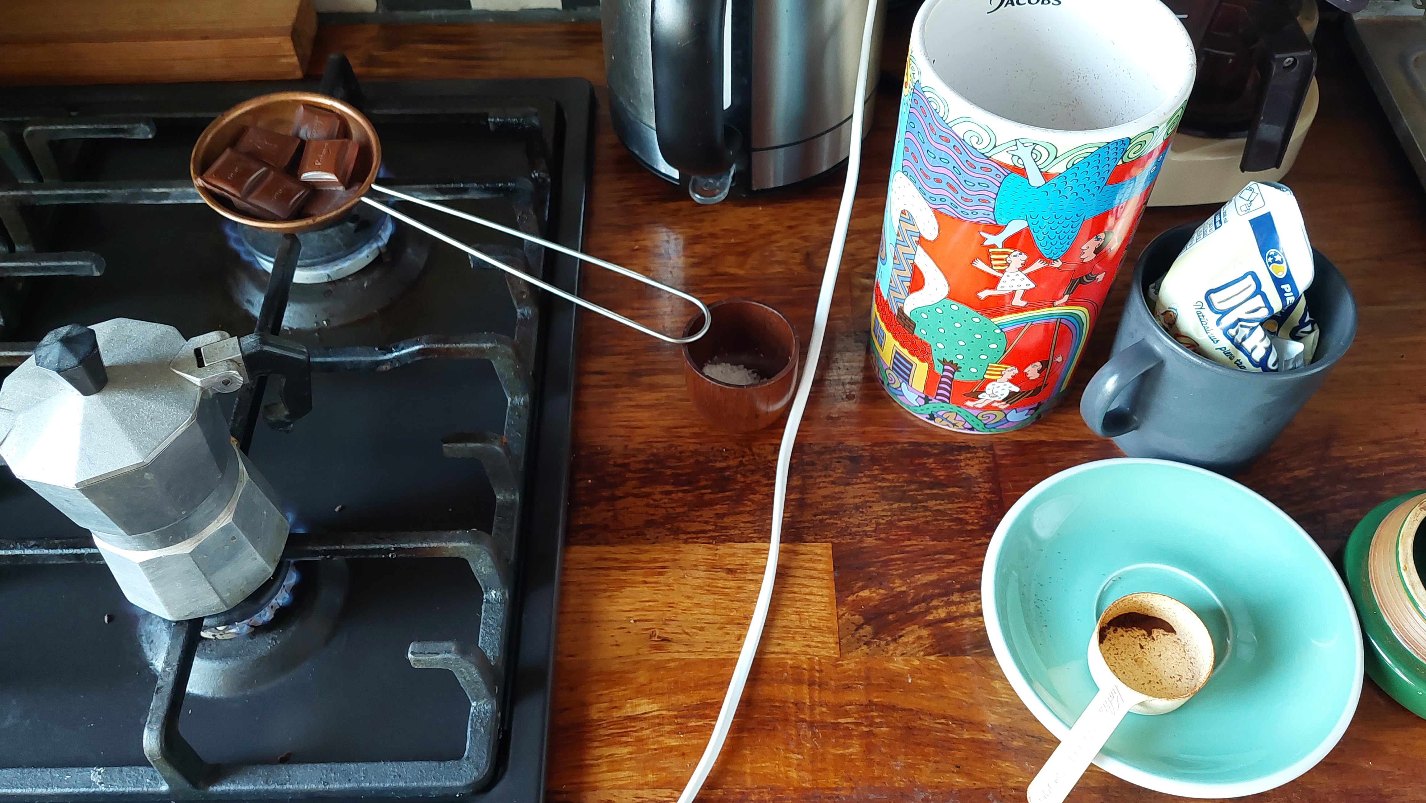 에스프레소 기계가 있으면 한 번에 끝날 일이지만 없으므로 모카 포트로 에스프레소 추출하고 언젠가 친척언니가 보내준 달고나용 국자에 집에 있던 초콜릿을 녹여서 핫초코를 만들고 크림도 거품기를 사용해 만들어주었다.