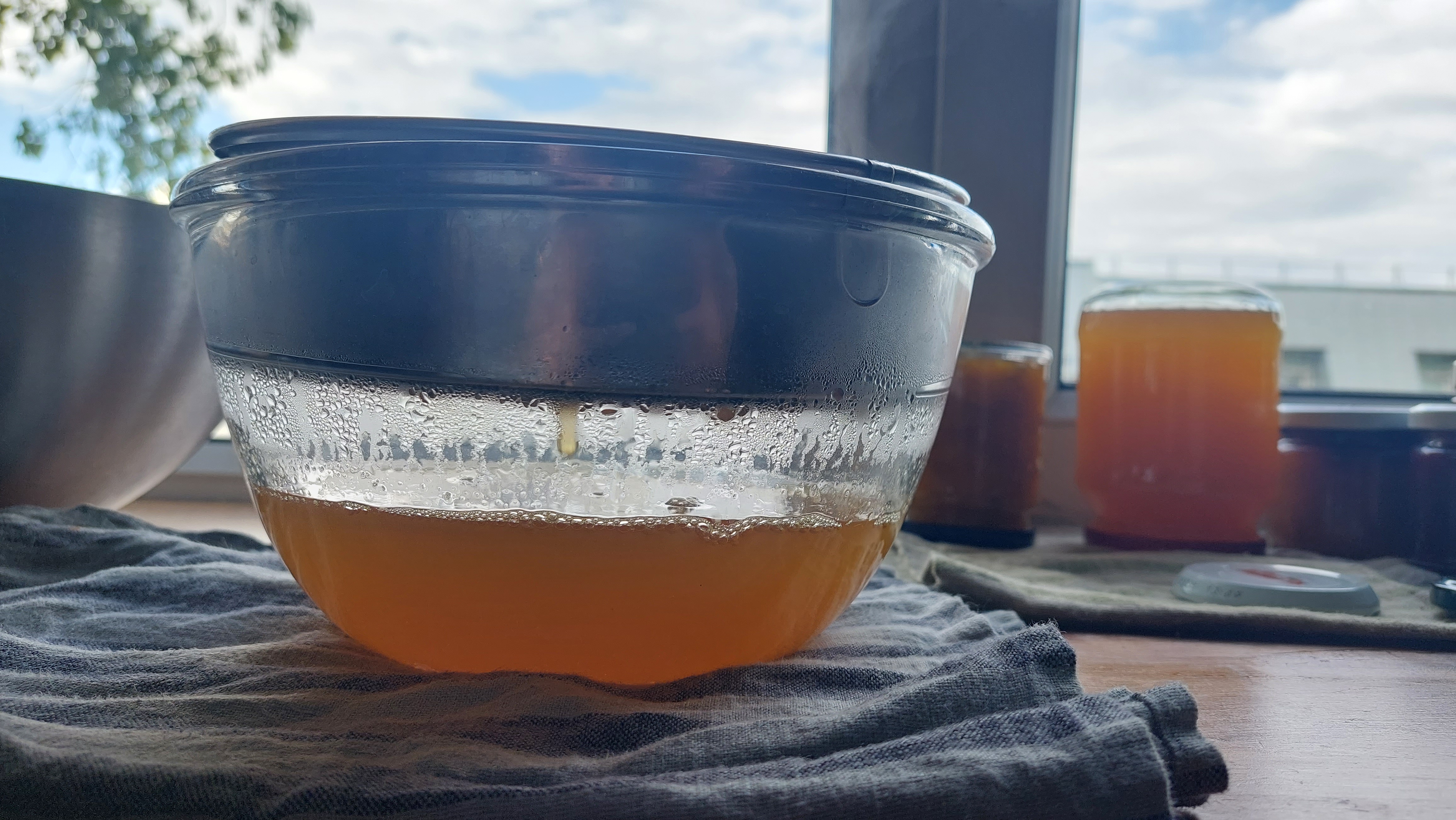 체에 부어놓고 기다리며 좀 휘저어주면 흘러내린다. 시럽보다는 좀 묽고 주스보다는 농도가 짙었는데 대략 3리터 정도가 나왔다.