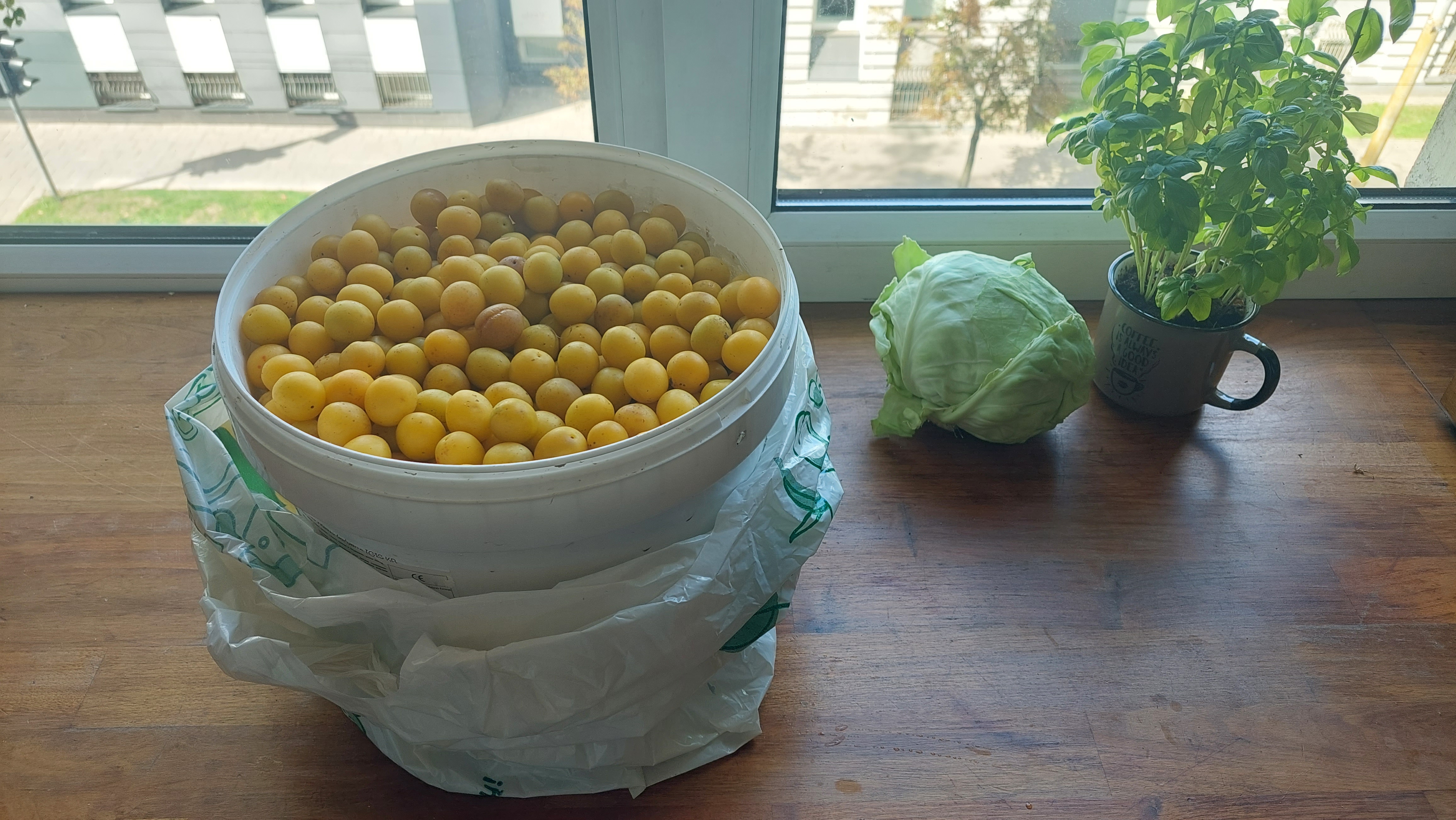 지난달에 동료가 바람이 불어 마당에 노랑 자두가 많이 떨어졌는데 그걸로 뭘 해야 할지 모르겠다고 주겠다고 했다. 20년 넘게 그 집에 사는 친구가 자두의 용도를 모를 일이 없다. 이제는 다 귀찮아서 자두로 아무것도 하고 싶지 않다는 의미이다. 며칠 후에 정말 큰 비가 오더니 자두가 전부 다 떨어졌다며 줍느라 너무 힘들었다고 다 가져가라고 하는 친구. 그래서 가져왔다. 작은 정교 성당 앞 벤치에 한번 앉고 구청사 계단에 한번 앉고 가톨릭 성당 앞에 한번 앉으니 얼추 집에 도착했다.