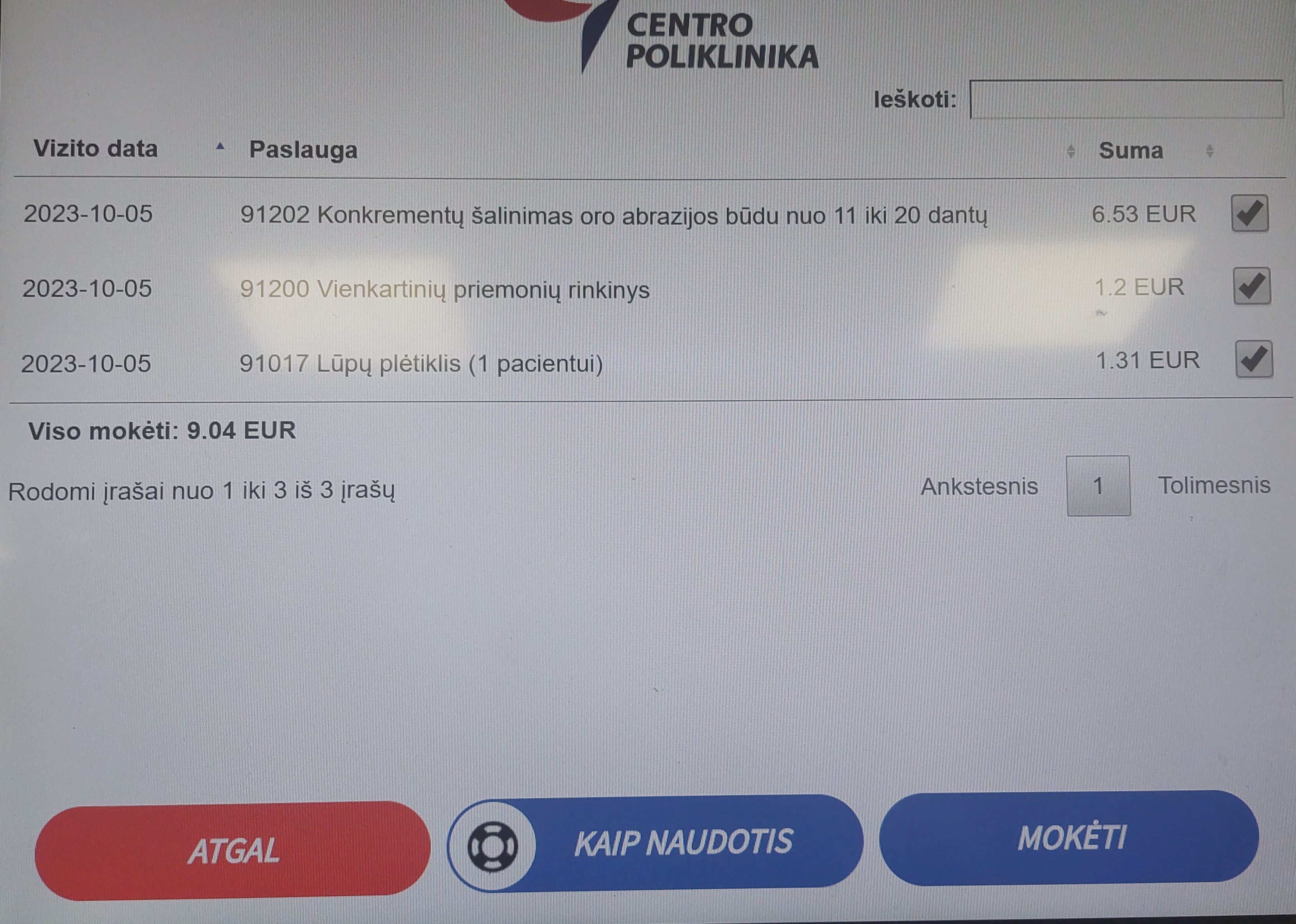 치료 내내 입을 벌리고 있기 힘든 사람을 위해 친절하게 끼워주는 개구기는 Lūpų plėtiklis 1.3유로. 그 외에 내가 사용한 안경과 입을 헹구는 데에 쓴 일회용 컵과 입을 닦는데 쓴 휴지 두 칸과 치위생사님께서 착용한 장갑 등등은 나를 위한 모둠 일회용품에 묶여서 1.2유로. 치위생사님의 업적에는 6.5유로를.