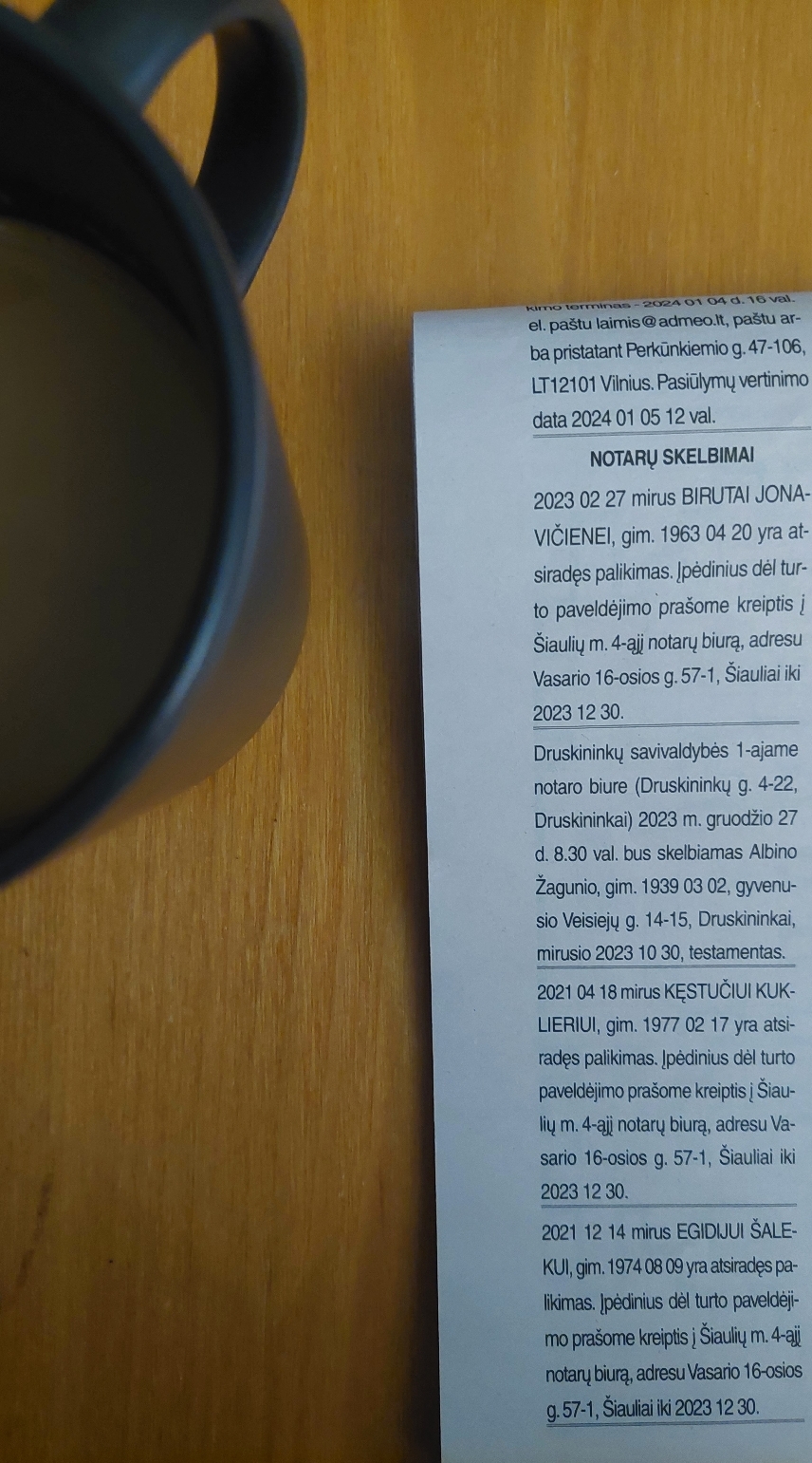 동네 곳곳에 공증 사무실이 정말 많다. 간판에 보통 'Vilniaus m.10-asis notaro biuras 빌니우스시 10번째 공증 사무실' 이런 식으로 적혀있다. 오래전에 종로 구청 근처 공증 사무실에서 몇 가지 증명서를 영문 번역하여 공증을 받았었다. 그 서류들을 리투아니아어로 번역해서 다시 공증받은 후에야 효력이 생긴다. 지금은 인터넷에서 내려 받을 수 있는 서류도 많고 아포스티유도 발급이 되니 전에 비하면 모든 것이 엄청 간단해진 듯 보이지만 해외에 거주하면서 신분증이나 거주 관련 문서들을 준비하고 갱신하는 것은 어쨌거나 참 손이 많이 가는 일이다. 그래도 지금까지 늘 별문제 없이 잘 진행되었으니 한편으론 고맙다.