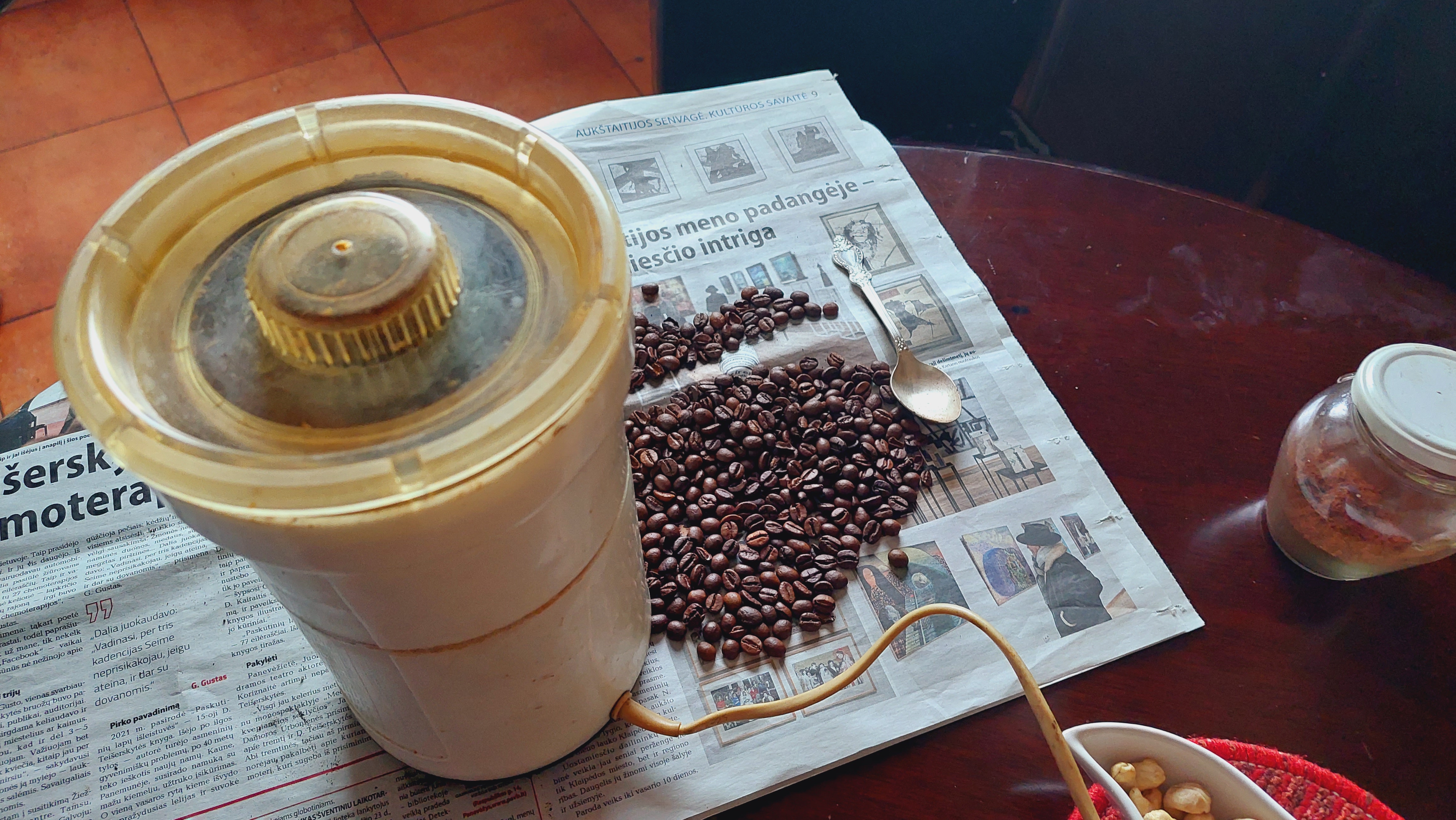 지난 크리스마스 휴가동안 파네베지에 있으면서 소련 시절의 오래된 고기분쇄기로 커피를 갈아 마셨다. 바닥에 쓰여진 대로라면 러시아어로 먀싸루프까Мясорувка, 리투아니아어로는 메스말레 Mėsmalė 라고 한다. 탁자에 고정시키고 손수 돌리는 수동 고기분쇄기의 대안이 되지 못하고 밀려버린 것. 이것으로 고기를 갈면 균일한 다짐육이 되지 못하고 필요 이상으로 짓이기고 뭉개져서 막상 고기는 잘 안 갈았다고 한다. 작은 분쇄칼을 추가로 끼우면 커피콩 같은 다른 것을 갈 수 있다.