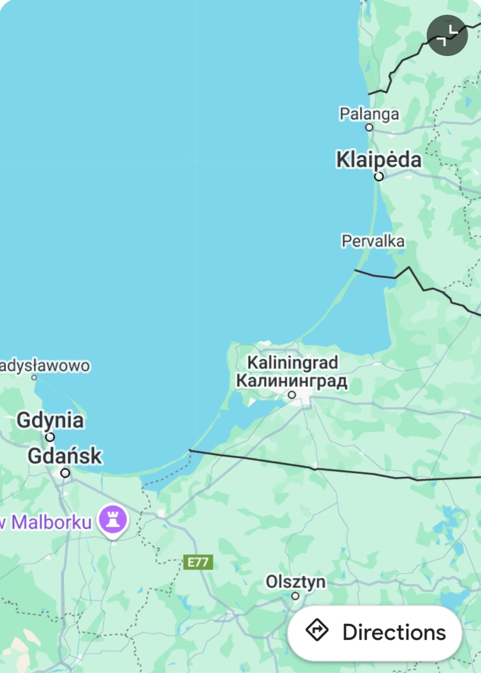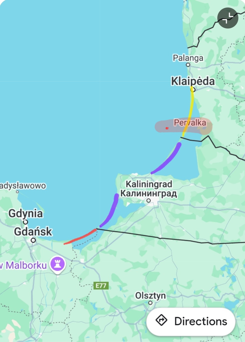 지도에서 붉은 부분은 폴란드령, 노란 부분은 리투아니아령, 중간의 보라색은 러시아땅이다. 드라싸 가 아빠와 맥주를 홀짝였던 페르발카도 보인다. 폴란드와 리투아니아 사이에 생뚱맞게 알 박기를 하고 있는 러시아 월경지 칼리닌그라드는 그렇다 치고 칼리닌그라드에서 연결되는 사주는 흡사 러시아가 벌린 양팔에 폴란드와 리투아니아가 한 짝씩 마지못해 붙잡혀 있는 형상이다.