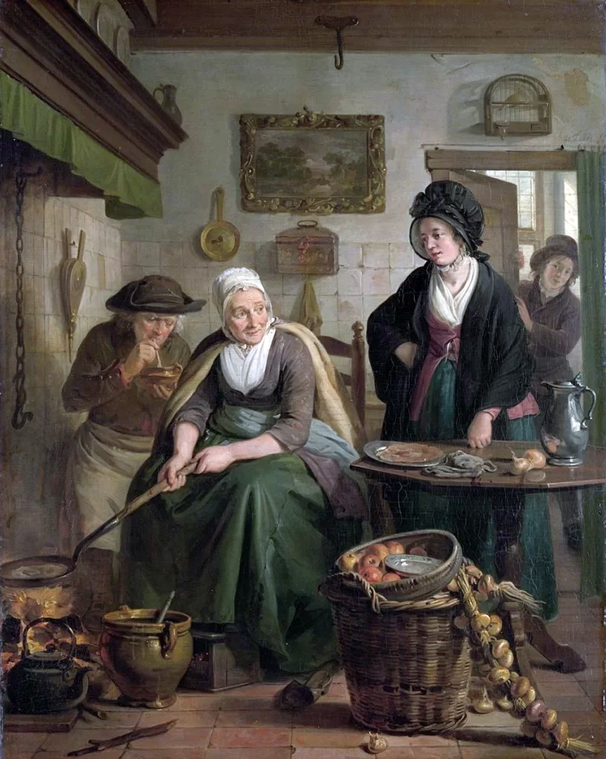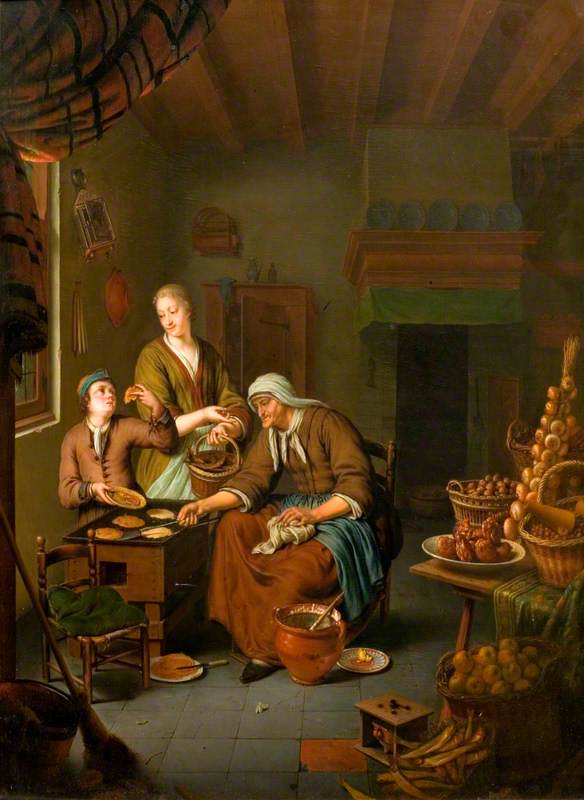 18세기의 여인들도 팬케이크를 굽는다.  뜯어진 바닥 타일에도 불구하고 17세기보다 훨씬 쾌적해진 부엌. 구운 팬케익을 양념도 없이 그냥 집어먹는 아이는 좀 눈치를 보는것 같고 엄마는 웃고는 있지만 뭔가 이를 악물고 바라보는 것 같고, 팬케익을 굽는 사람은 남편처럼 보이는데 구운 팬케익을 바닥에 저렇게 놔두다니 저기가 식당이고 21세기 위생국에서 감사 나오면 저런 건 얄짤없다. 그래도 아빠의 반죽 항아리는 거의 바닥을 보이는 것 같다. 입을 앙다물고 마지막 스퍼트를 내고 있다. 구워 놓은 팬케이크는 사실 별로 많아 보이지 않는데 아마 아이가 굽는 족족 먹어버렸는지도.