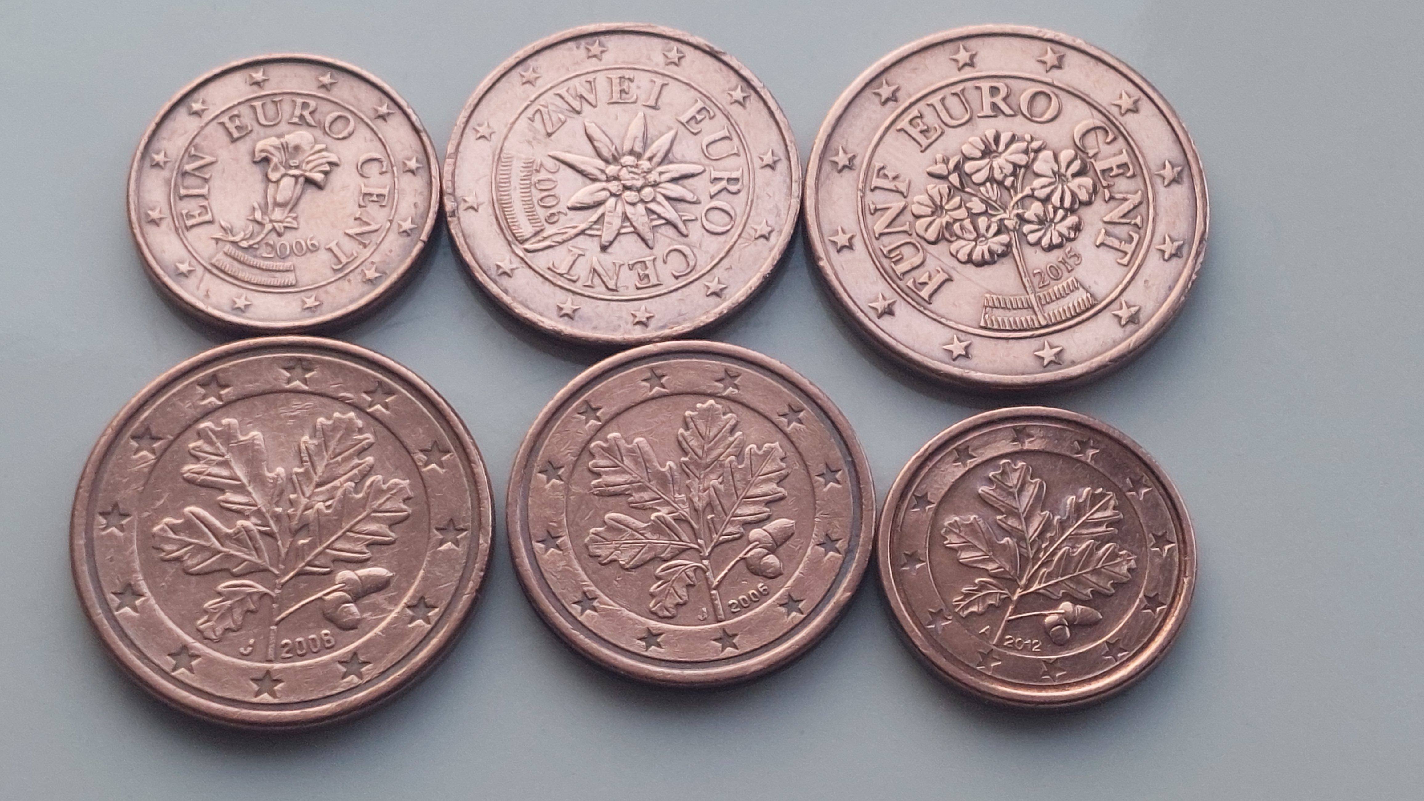 핀란드 2유로 동전을 포함해서 식물 도안의 유로 동전들이 몇 종류있다. 특히 이 여섯 종류의 오스트리아동전과 독일 동전들은 사실 헷갈리기 쉽다. 아래는 전부 동일한 식물 도안의 독일 1.2.5센트 동전이고 위는 오스트리아 1.2.5센트 동전들이다. 아인 츠바이 퓐프를 적어 액면가를 표시했고 5센트 동전의 협소함을 극복하고 움라우트를 깨알같이 표시했다. 알파벳을 적어서 독일 동전과 구별되고자 했는지 모르지만 오히려 이것때문에 늘 헷갈리곤 했다. 하지만 꽃장식 아래에 오스트리아 국기가 보인다. 물론 이 오스트리아 참빗 국기를 알아보기 전까지도 오랫동안 이들이 독일 동전이라고 생각했었다.