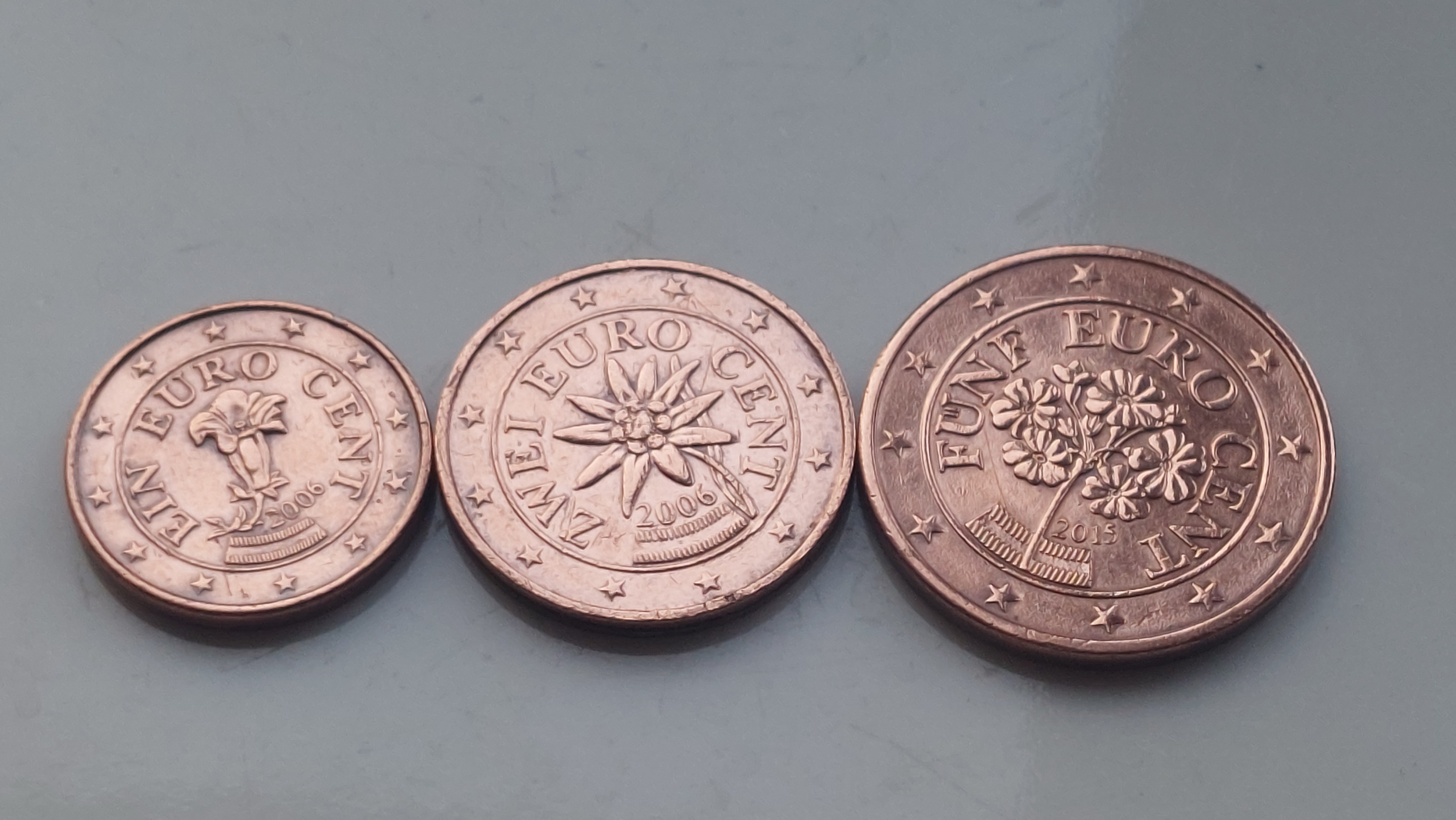 오스트리아 국기를 토양처럼 삼고 오스트리아 소액 센트 동전 속에 피어있는 세 종류의 식물들. 유럽 중앙은행의 오스트리아 동전 페이지에는 이들 주인공들을 각각 Gentian, Edelweiss, Alpine primroses로 표기하고 있다. 식물들도 태어난 지역에 따라 생김새가 조금씩 달라지고 부르는 이름도 다양해져서 특정 이름을 딱 지정하는 것이 쉽지가 않은데 우선 영어명을 알아두는 것이 결국 가장 편한 것 같다. 찾아보니 이 명칭 그대로 겐티아나, 에델바이스, 알프스 로즈 혹은 프림로즈로 부르거나 각각 용담, 에델바이스, 앵초꽃 등으로 번역하기도 한다.