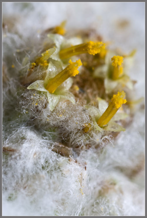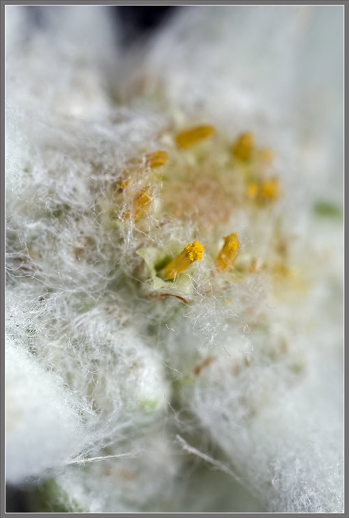 초정밀 현미경으로 촬영해서 놀랍지 않은 세상만물이 어디 있겠냐 마는 시선을 끄는 독보적인 하얀 잎을 뒤로하고 에델바이스를 당기고 또 당기면 마치 강황가루에 떨어진 정향을 가느다란 핀셋으로 집어 탈탈 털어놓은 듯 예민한 노란 부분들이 최종적으로 모습을 드러낸다. 에델바이스는 아주 따뜻한 옷을 입고 알프스를 이겨내고 있는거다. 그들을 둘러싸고 겹겹이 채워진 솜털은 한밤중의 추위와 한낮의 강한 자외선으로부터 꽃을 지켜준다. 그래서 에델바이스가 하얀색을 띠게 되고 피부 보습이나 자외선 차단제등의 화장품에 추출물을 사용하는 경우가 많다고 한다.