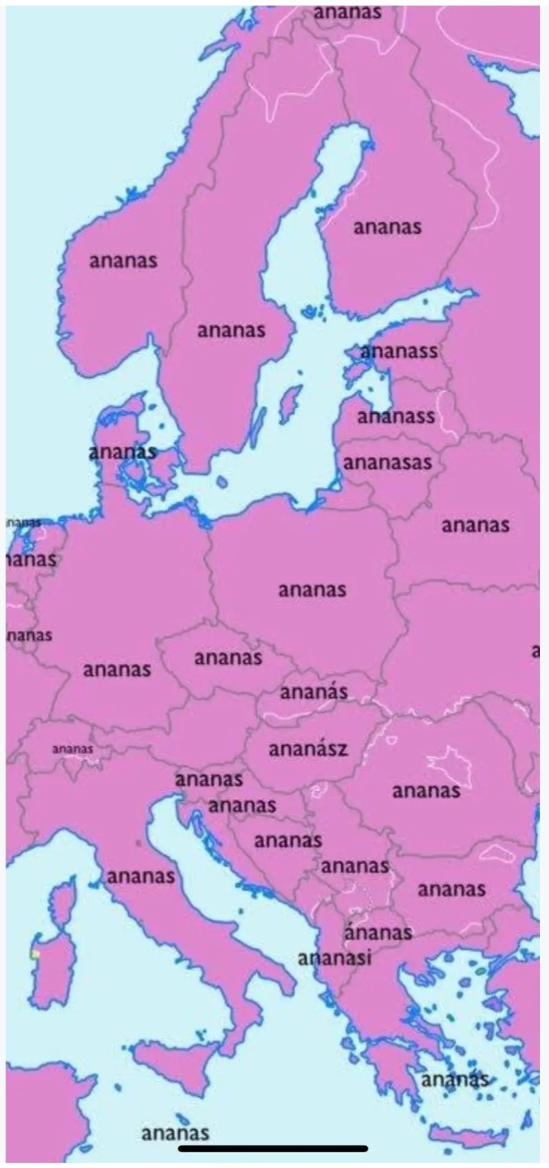 비슷한 경우로 바나나가 있다. 하지만 바나나는 이미 모음으로 끝나는 단어라서 리투아니아 남성어미 -as를 붙여 변형을 해서 s가 튕겨져 나가도 결국 바나누가 될뿐이므로 바나나로써의 소중한 느낌을 간직한다. 바나누는 뭔가 슬픈열대에 나올법한 부족의 명칭같고 실제 바나나처럼 되직한 느낌이 들어서 괴리감이 덜하다.