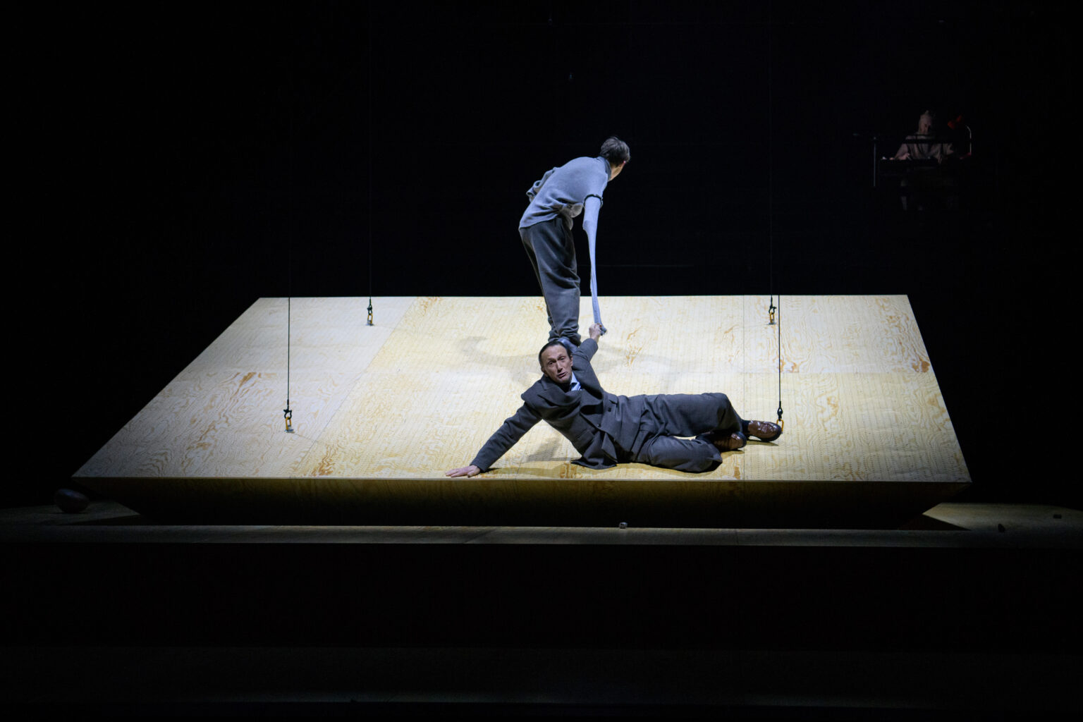 공중에 매달린 거대한 장치 위로 인물들이 올라간다. 아버지와 아들, 아내와 남편, 엄마와 아들의 불안정한 관계들, 그들이 정상적인 소통에 얼마나 애를 먹고 있는지를 보여주려 했을 그 무대 장치는 탁월했다. 그래서 저 장치가 앞으로 기울면 배우들이 잘 보였지만 높은 위치에서 수평을 유지하거나 반대로 기울면 도무지 보이지가 않았다. 하지만 그 마저도 갈등하는 두 인물 사이에서 관람객으로밖에 남을 수 없는 손발이 묶인 제삼자의 위치라고 합리화하며 연출된 세트에 감탄하는 길을 택한다.
