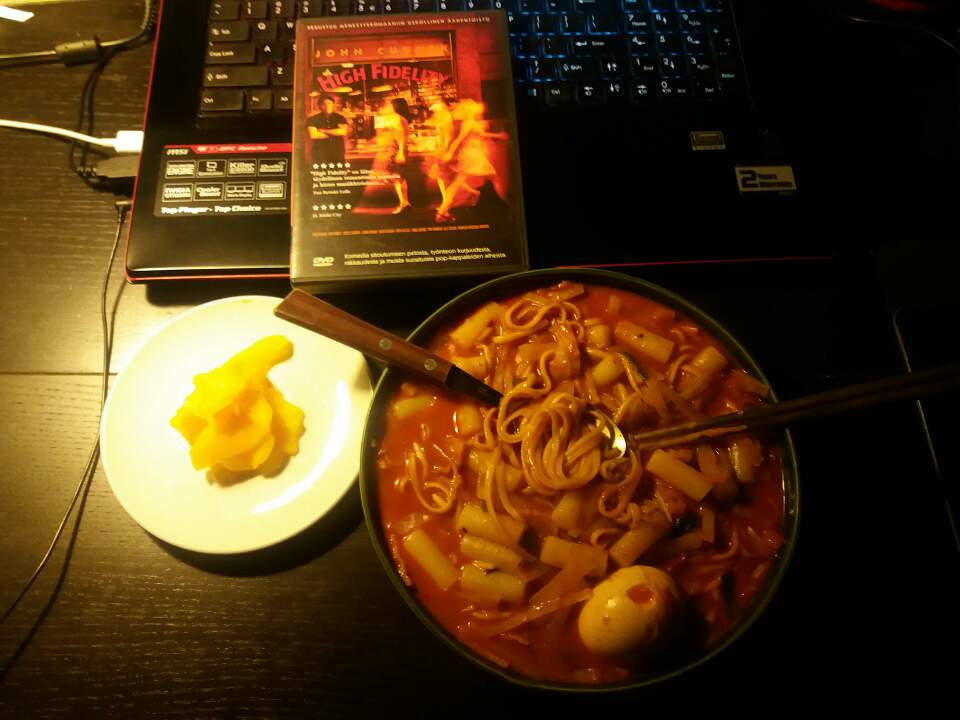 양배추를 비롯한 각종 야채와 면과 삶은 달걀까지 집어넣어 양을 잔뜩 늘린 이 신성한 떡볶이의 배경으로 선택된 영화는 닉 혼비의 원작을 각색한 영화, 한국어로는 '사랑도 리콜 되나요'라는 참으로 재치 있는 제목으로 번안된 스티븐 프리어즈의 High fidelity이다. 레코드 가게 주인 존 쿠삭이 그 인생의 5번의 처절한 이별에 대해 이야기하는 영화. 그리고 그 도중에 흐르는 수많은 음악과 그 음악에 대한 담론. 저마다 자기 취향에 입각해 그날의 탑 파이브에 대해 이야기하는 음악에 미친 괴짜 레코드 가게 직원들. 베타 밴드와 스테레오 랩을 알게 해 준 영화. 잭 블랙의 인생 연기, 잭 블랙의 노래. 이 영화 자체를 좋아하지만 무엇보다도 내 인생 영화인 이유는 20년 전 이 영화를 처음 보았던 그 순간부터 나에게도 틈만 나면 나만의 각종 리스트를 선정하는 버릇이 생겼기 때문이다. 이 영화는 좋아하는 영화 Top 20에 들어가고 좋아하는 사운드트랙 Top 10에 들어가며 맛있는 음식을 먹을 때 보고 싶은 영화 Top 5이며 잭 블랙 영화 Top 3이다.